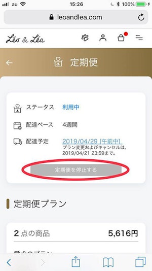 定期便のキャンセルは超簡単! 定期便ページにある「定期便を停止する」というボタンを押すだけです。